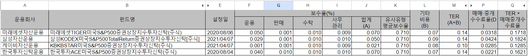미국 S&P500 지수를 추종하는 국내상장 ETF 들의 총보수, 매매중개 수수료를 비교해보겠습니다.