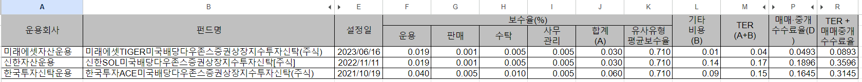국내상장 SCHD 지수추종 ETF, 미국배당다우존스들의 총보수, 매매중개 수수료를 비교해보았습니다.