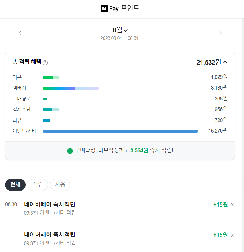 결제할때도 네이버페이머니 계좌충전으로 추가 포인트도받고 멤버십으로 추가 포인트까지...