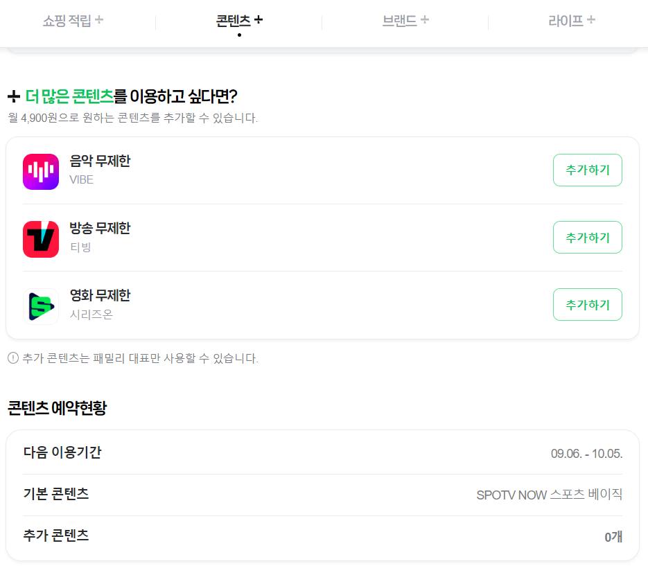 네이버에서 제공하는 구독형 서비스로 네이버페이로 쇼핑시 추가 적립, 방송,스포츠 컨텐츠 등 저렴한 가격에 다양한 혜택이 있는 정기구독 서비스입니다.