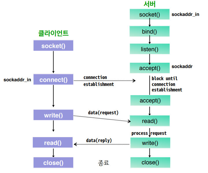● 서버가 명명되지 않은 소켓 생성시, bind()를 사용하여 이름 부여, 성공시 0, 실패시 -1