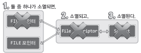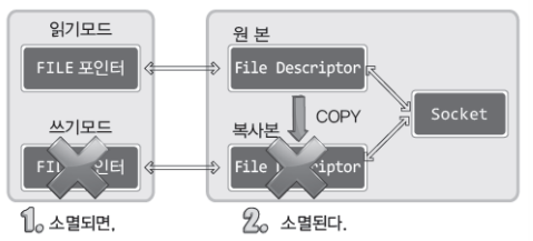 하지만 위의 경우에도 half-close는 진행되지 않는다. 여전히 하나의 FILE 디스크립터가 남아있고, 이를 이용해서 입출력이 가능해야 하기 때문에